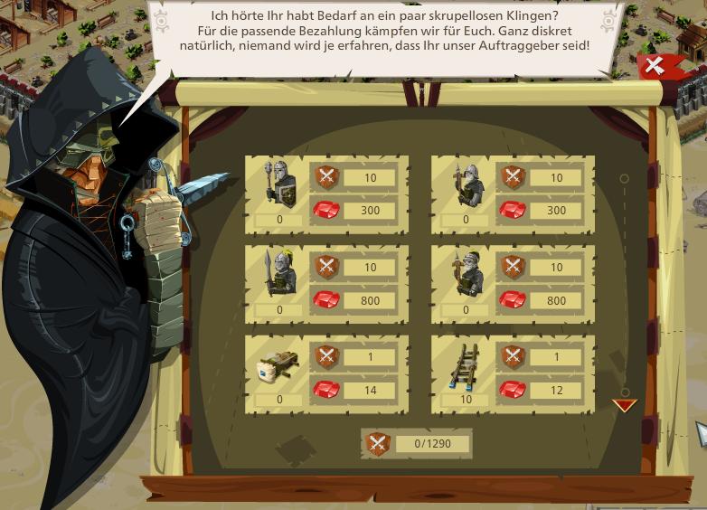 Im Schattensöldner-Lager könnt ihr für Rubine Truppen rekrutieren und passende Werkzeuge kaufen. Diese greifen dann von irgendwo auf der Karte an ohne, dass der Angriff mit euch in Verbindung gebracht werden kann. Ihr könnt bei solchen Angriffen weder Ruhm noch Ehre gewinnen. Außerdem sind die Schattensöldner nicht besonders stark.