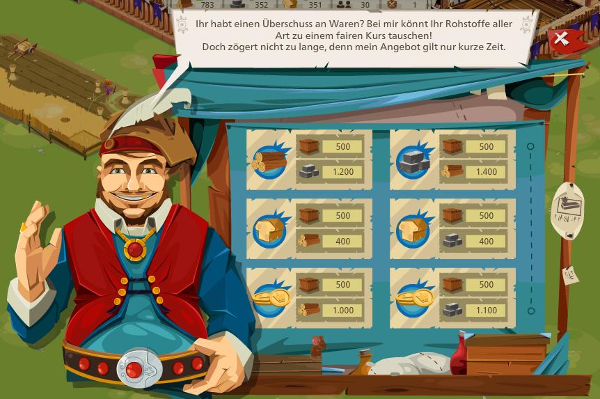 Beim Tauschhändler könnt ihr verschiedene Rohstoffe gegen andere eintauschen. Der Wechselkurs ist ziemlich schlecht.