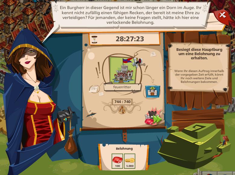 Die Zwielichtige Gestalt erzählt euch was von einem Burgherren, der ihr schon lange ein Dorn im Auge ist. Ihr sollt ihn besiegen und bekommt dafür etwas. Das Problem ist, dass die Zwielichtige Gestalt keine Rücksicht auf Bündnisse oder Tauben nimmt. Durch Rubine kann man sich inzwischen ein neues Ziel zuteilen lassen.