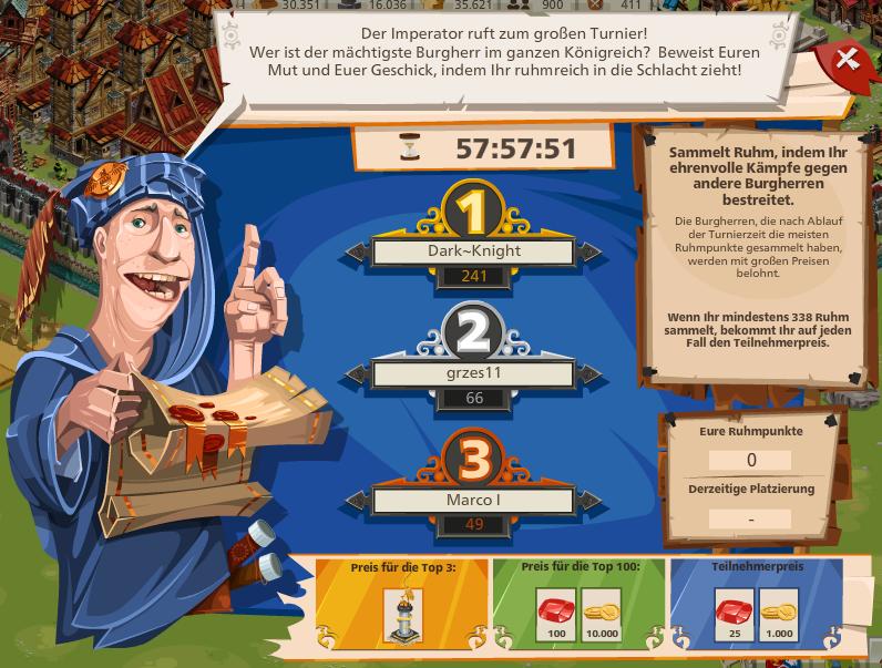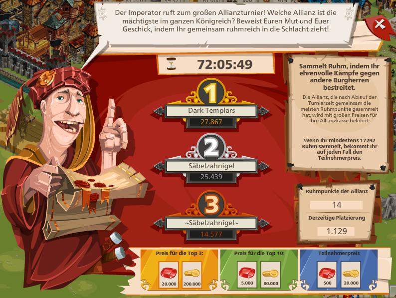 Im Zelt des Herolds werdet ihr aufgefordert am Turnier teilzunehmen. Das Ziel ist es durch Angriffe möglichst viel Ruhm zu bekommen. Für jeden Teilnehmer gibt es am Ende einen Preis, die Besten 100 bekommen etwas mehr und die Besten 3 erhalten einen Speziellen Preis.
