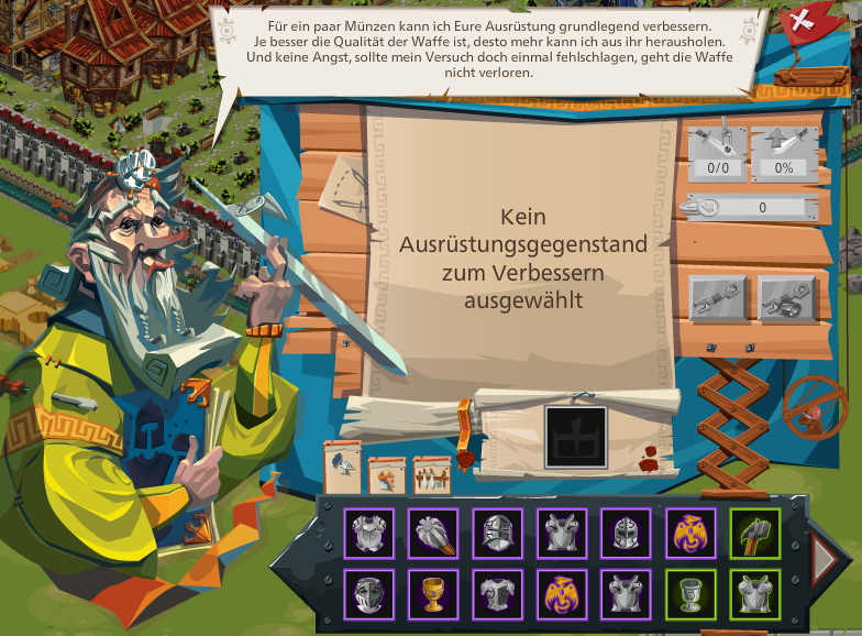 Beim Technikus könnt ihr eure Ausrüstungsgegenstände, gegen Gold, verbessern lassen. Je besser der Gegenstand werden soll, desto mehr erinnert es an Glücksspiel, weil die Verbesserung nicht immer funktioniert, das Geld aber trotzdem weg ist.