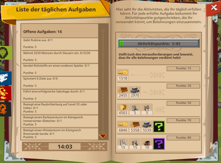 Im Questbuch gibt es nicht nur die Aufgaben innerhalb der Geschichte, um Level aufzusteigen, Neue Königreiche zu erkunden oder sich ein bisschen was zu verdienen, sondern jetzt auch täglich kleine Aufgaben um die Wartezeiten in der Burg zu überbrücken.